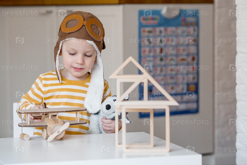 Маленький мальчик 3-х лет в пилотской шапке играет в деревянный самолетик и развивающий логистический конструктор. Детские деревянные игрушки для развития ребенка