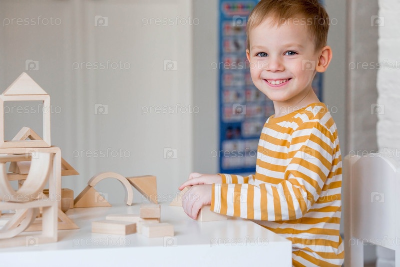Маленький мальчик 3 лет играет в развивающий логистический конструктор. Детские деревянные игрушки. Монтессори для развития ребенка