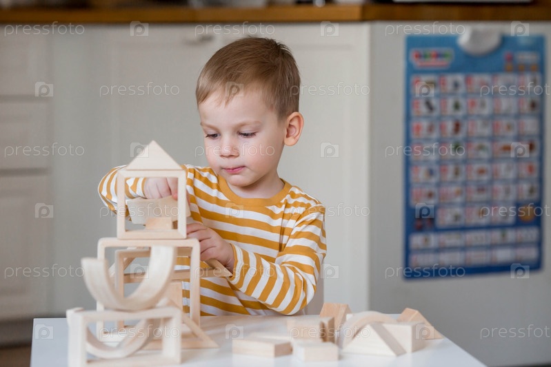 Маленький мальчик 3 лет играет в развивающий логистический конструктор. Детские деревянные игрушки. Монтессори для развития ребенка