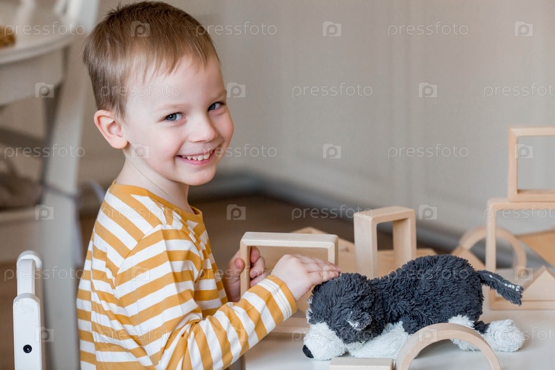 Маленький мальчик 3 лет играет в развивающий логистический конструктор. Детские деревянные игрушки. Монтессори для развития ребенка