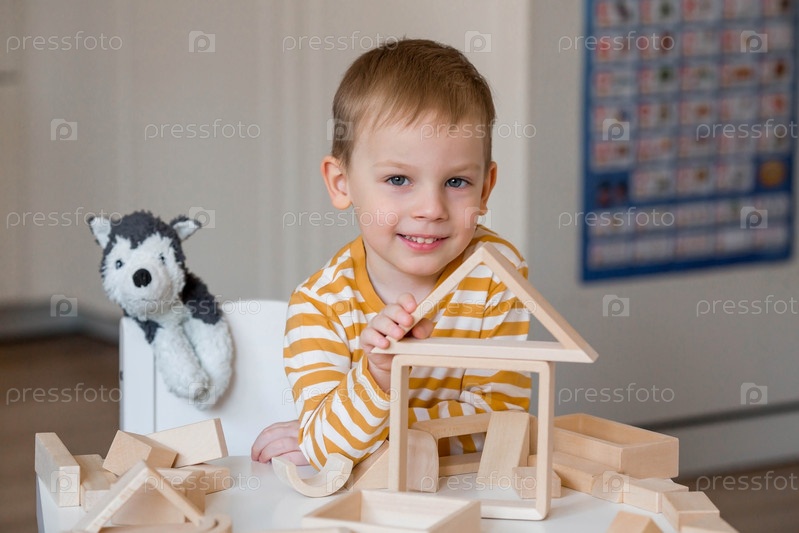 Маленький мальчик 3 лет играет в развивающий логистический конструктор. Детские деревянные игрушки. Монтессори для развития ребенка