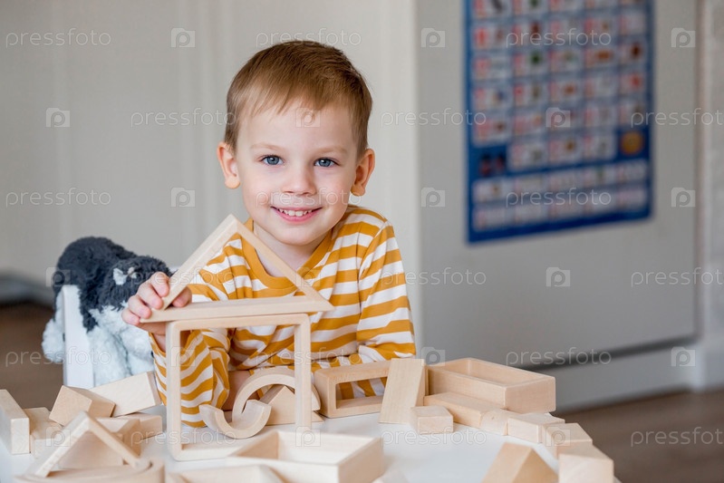 Маленький мальчик 3 лет играет в развивающий логистический конструктор. Детские деревянные игрушки. Монтессори для развития ребенка