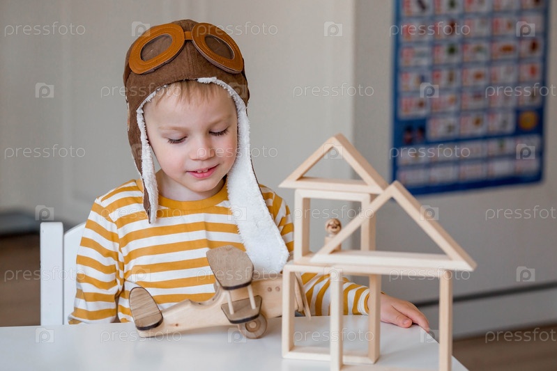 Маленький мальчик 3-х лет в пилотской шапке играет в деревянный самолетик и развивающий логистический конструктор. Детские деревянные игрушки для развития ребенка