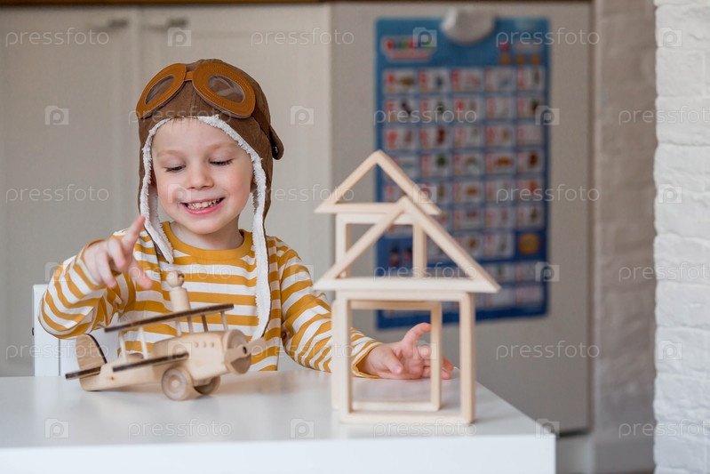 Маленький мальчик 3-х лет в пилотской шапке играет в деревянный самолетик и развивающий логистический конструктор. Детские деревянные игрушки для развития ребенка