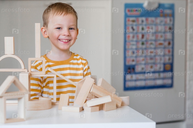 Маленький мальчик 3 лет играет в развивающий логистический конструктор. Детские деревянные игрушки. Монтессори для развития ребенка
