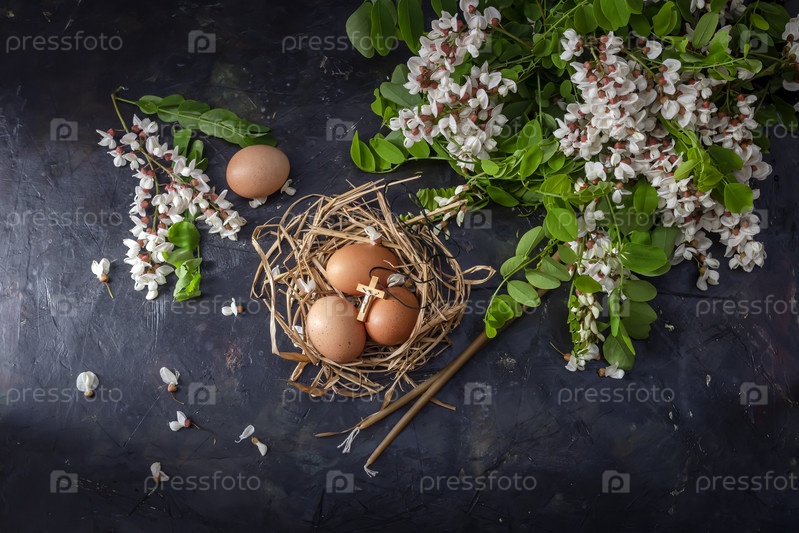 Пасхальная композиция с цветами, свечами и яйцами