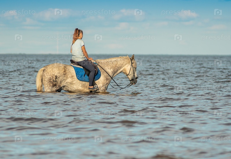 Молодая женщина сидит верхом на лошади. Выборочный фокус. Лошадь в воде
