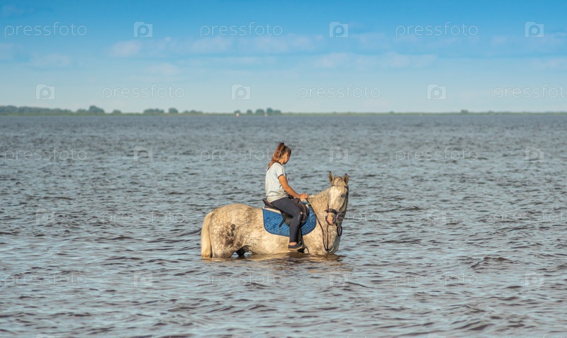 Молодая женщина сидит верхом на лошади. Избирательный фокус. Лошадь в воде