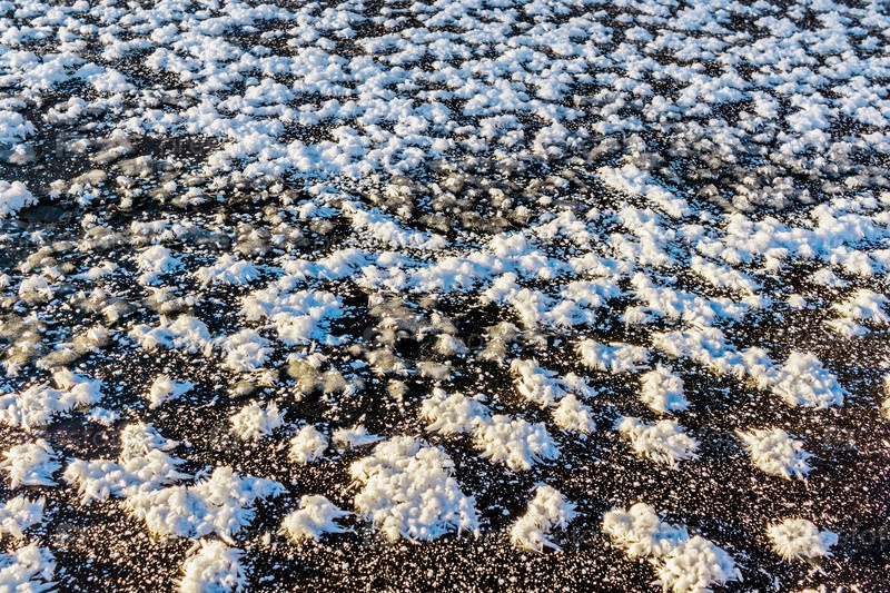 Крупный план морозных цветов на поверхности черного льда в свете восходящего солнца