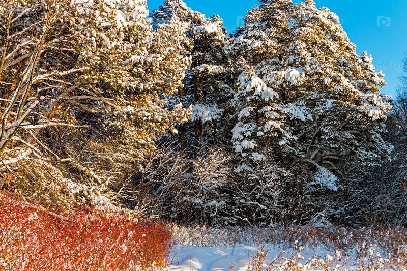 Пейзаж с сосновым лесом в морозный и солнечный зимний день