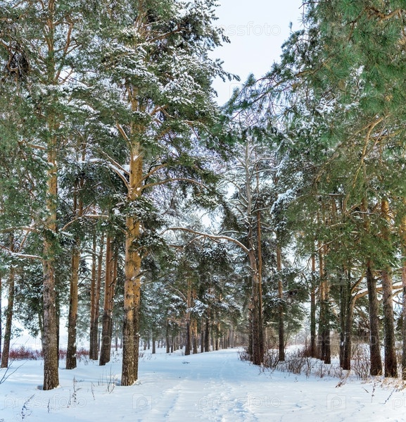 Тропинка в сосновом лесу в хмурый зимний день