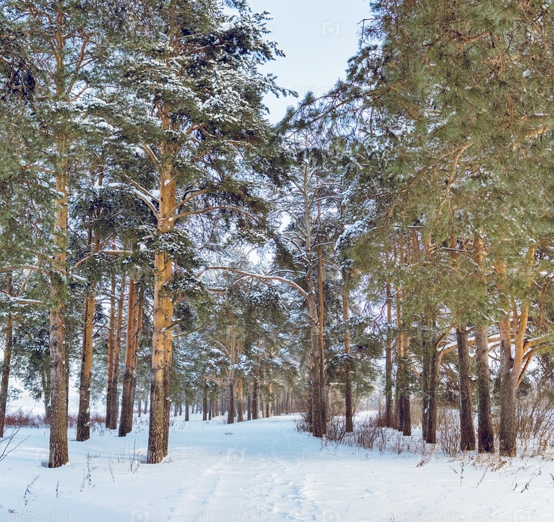 Пейзаж с тропинкой в сосновом лесу в хмурый зимний день