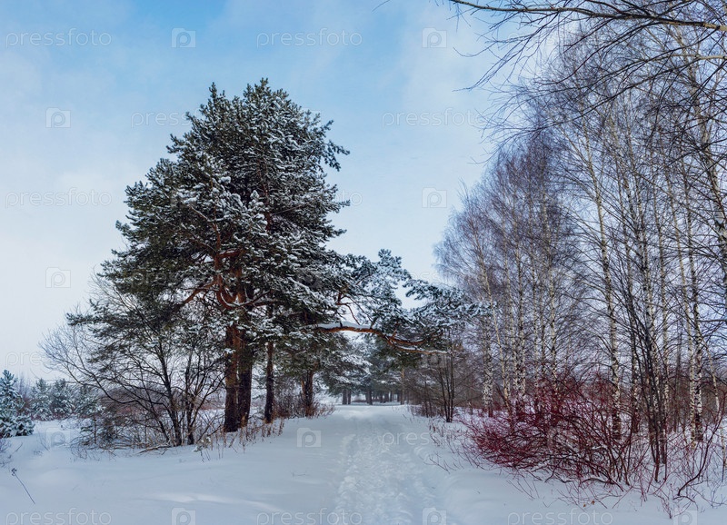 Пейзаж с тропинкой в лесу хмурым и снежным зимним вечером