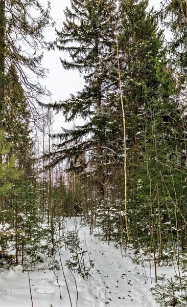Пейзаж с тропинкой в еловом лесу в хмурый зимний день