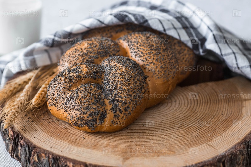 Классическая пшеничная коса с маком. Вкусный хлеб крупным планом. Свежеиспеченный хлеб на закваске с золотой корочкой на деревянной доске. Контекст пекарни с вкусным хлебом. Кондитерские изделия