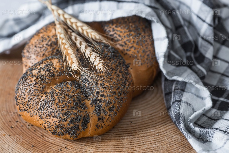 Классическая пшеничная коса с маком. Вкусный хлеб крупным планом. Свежеиспеченный хлеб на закваске с золотой корочкой на деревянной доске. Контекст пекарни с вкусным хлебом. Кондитерские изделия