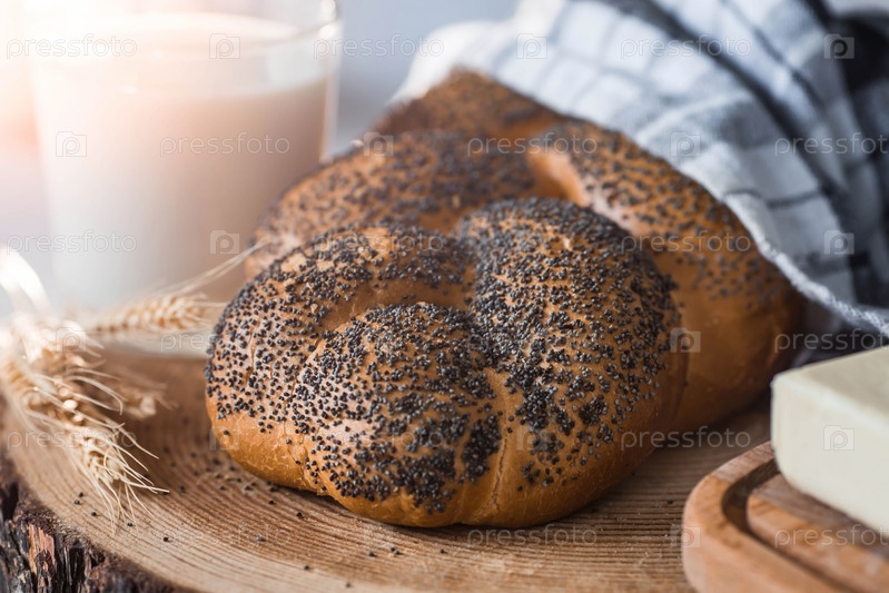 Классическая пшеничная коса с маком. Вкусный хлеб крупным планом. Свежеиспеченный хлеб на закваске с золотой корочкой на деревянной доске. Контекст пекарни с вкусным хлебом. Кондитерские изделия