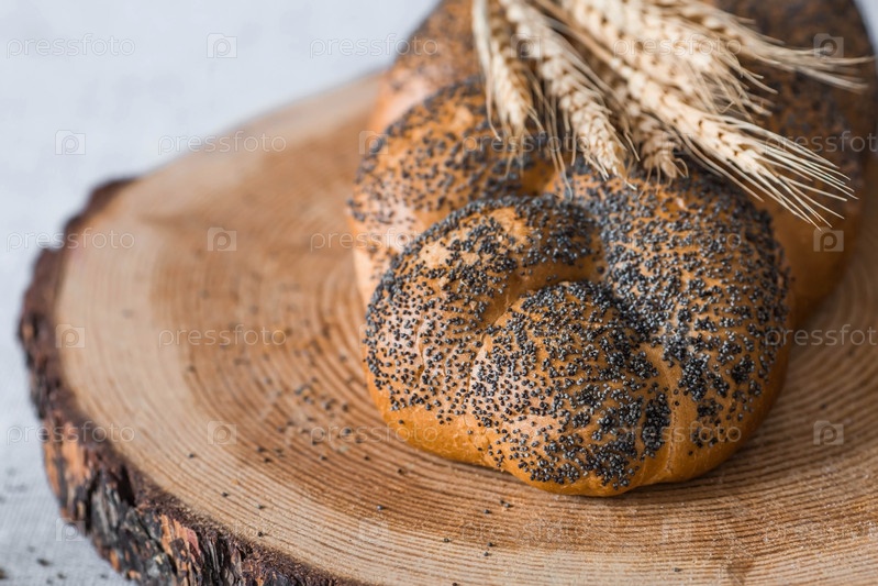 Классическая пшеничная коса с маком. Вкусный хлеб крупным планом. Свежеиспеченный хлеб на закваске с золотой корочкой на деревянной доске. Контекст пекарни с вкусным хлебом. Кондитерские изделия