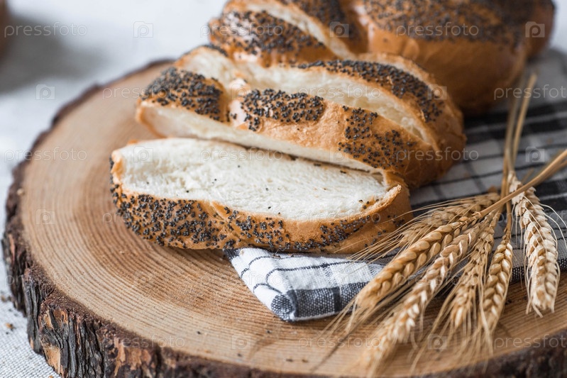 Классическая пшеничная коса с маком. Вкусный хлеб крупным планом. Свежеиспеченный хлеб на закваске с золотой корочкой на деревянной доске. Контекст пекарни с вкусным хлебом. Кондитерские изделия