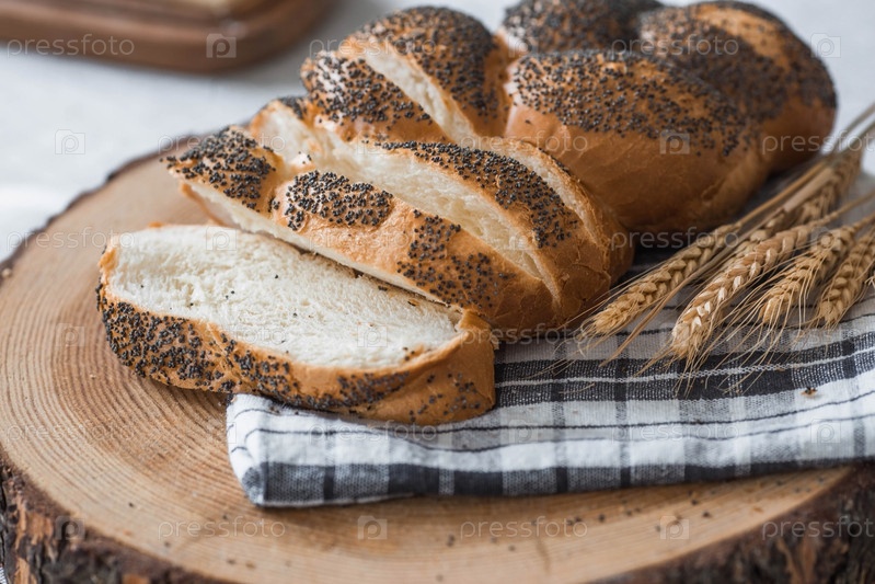 Классическая пшеничная коса с маком. Вкусный хлеб крупным планом. Свежеиспеченный хлеб на закваске с золотой корочкой на деревянной доске. Контекст пекарни с вкусным хлебом. Кондитерские изделия