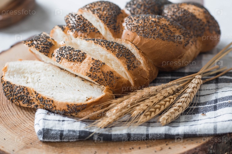 Классическая пшеничная коса с маком. Вкусный хлеб крупным планом. Свежеиспеченный хлеб на закваске с золотой корочкой на деревянной доске. Контекст пекарни с вкусным хлебом. Кондитерские изделия