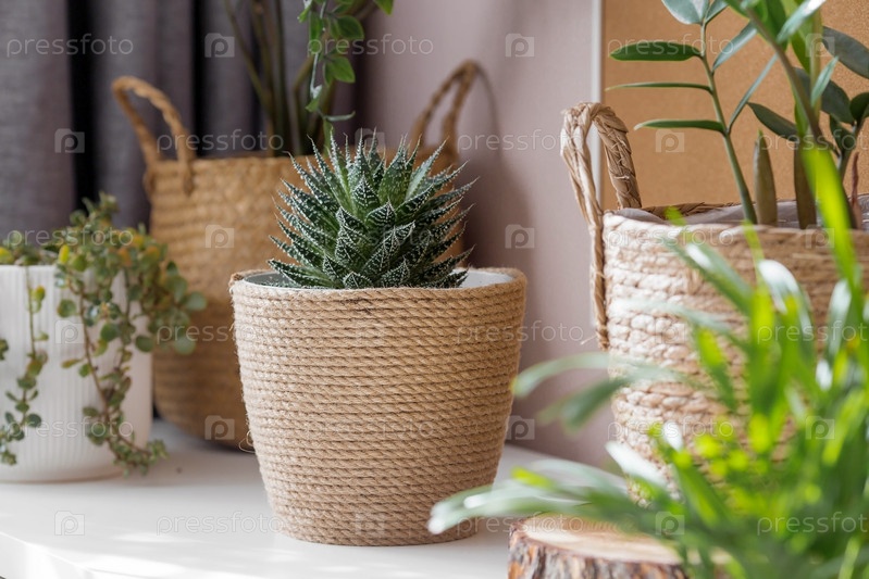 Садоводство, домашнее хозяйство и растениеводство. Многие комнатные растения растут в цветочных горшках в интерьере комнаты. Уход за цветком