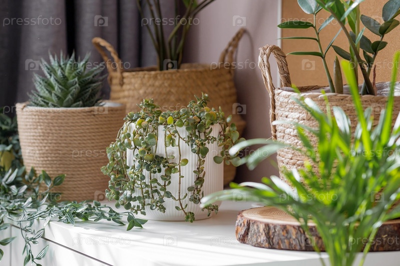 Садоводство, домашнее хозяйство и растениеводство. Многие комнатные растения растут в цветочных горшках в интерьере комнаты. Уход за цветком