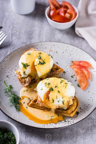 Вкусный домашний завтрак с вафлями, беконом и яйцами бенедикт на тарелке. Вертикальный вид