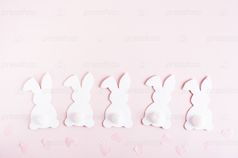 Счастливой пасхи белые картонные кролики подряд и сердечки на розовом фоне вид сверху