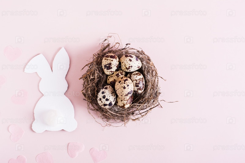 Счастливого пасхального гнезда с перепелиными яйцами и белым картонным кроликом на розовом фоне, вид сверху