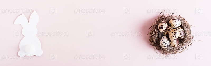 Веб-баннер счастливые пасхальные перепелиные яйца в естественном гнезде и белый кролик на розовом фоне вид сверху