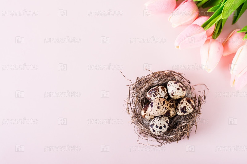 Счастливые пасхальные перепелиные яйца в естественном гнезде и букет цветов на розовом фоне вид сверху