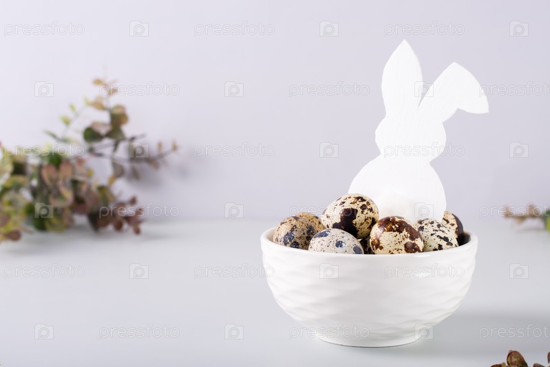 Перепелиные яйца и белый кролик в миске на сером столе для счастливой пасхи