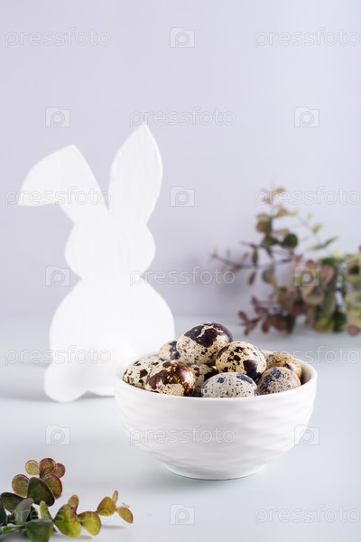 Миска перепелиных яиц и белый кролик на столе для счастливой пасхи. Вертикальный вид