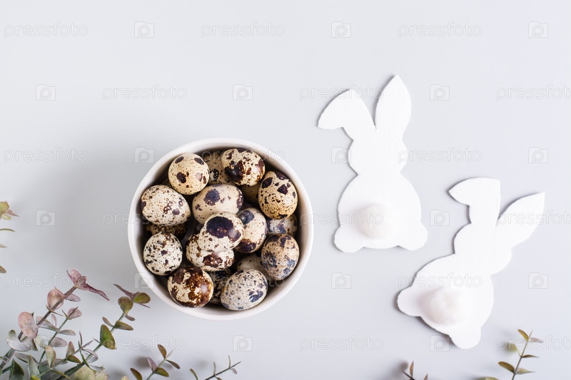 Пара белых кроликов и миска перепелиных яиц на сером фоне для счастливой пасхи сверху