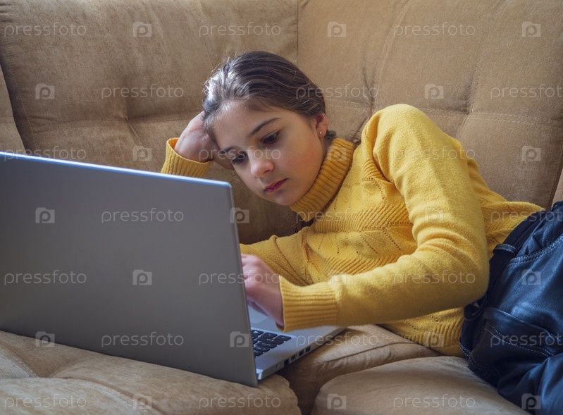 Девушка пользуется ноутбуком, лежащим на диване – реальная жизнь. Девочка-подросток в повседневной одежде смотрит на экран ноутбука, находясь дома. Онлайн-образование