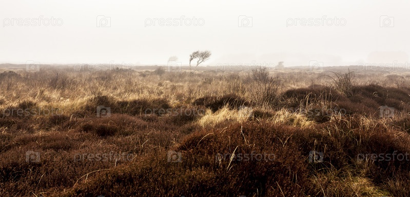 Голое одинокое дерево в утреннем осеннем тумане. Остров Тексель, Нидерланды