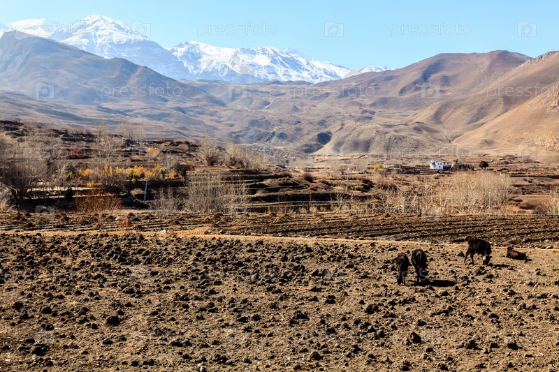 Азиатская горная деревня и террасные поля осенью в Нижнем Мустанге, Непале, Гималаях, заповеднике Аннапурны