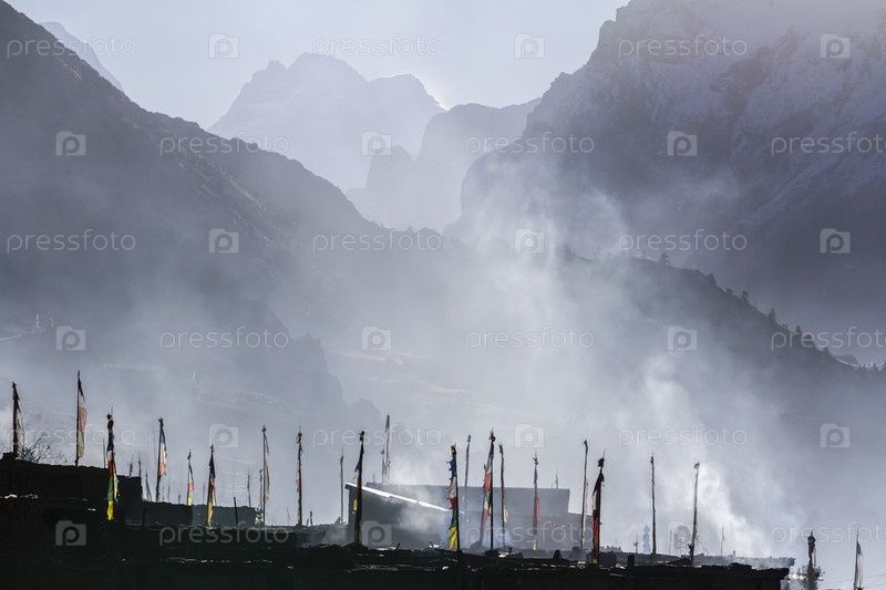 Молитвенные флаги в деревне Мананг. Туманное утро, Непал, Гималаи, заповедник Аннапурны