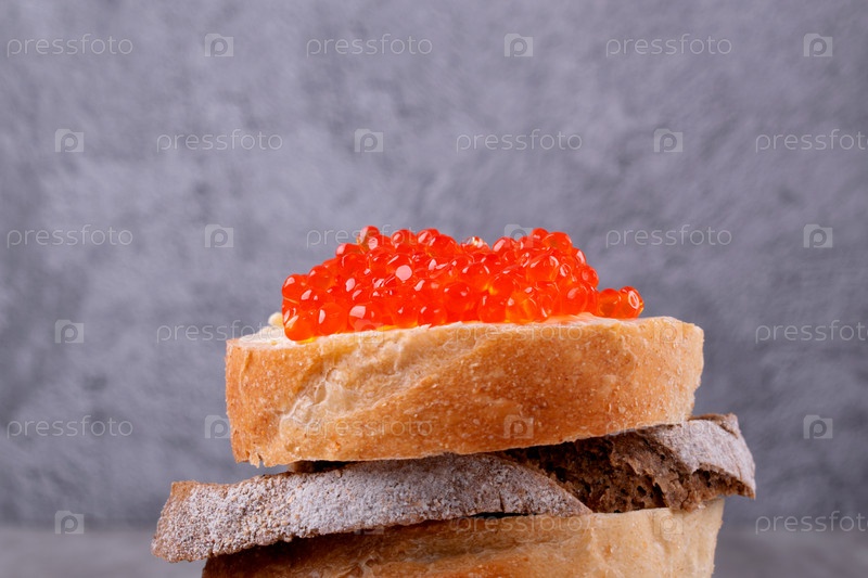 Бутерброд с красной икрой и маслом на пшеничном хлебе на сером фоне. Копировать пространство