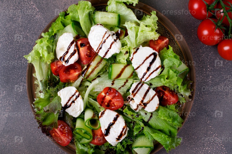 Салат с сыром моцарелла, листьями салата, огурцами и помидорами, покрытый бальзамической глазурью. Вид сверху