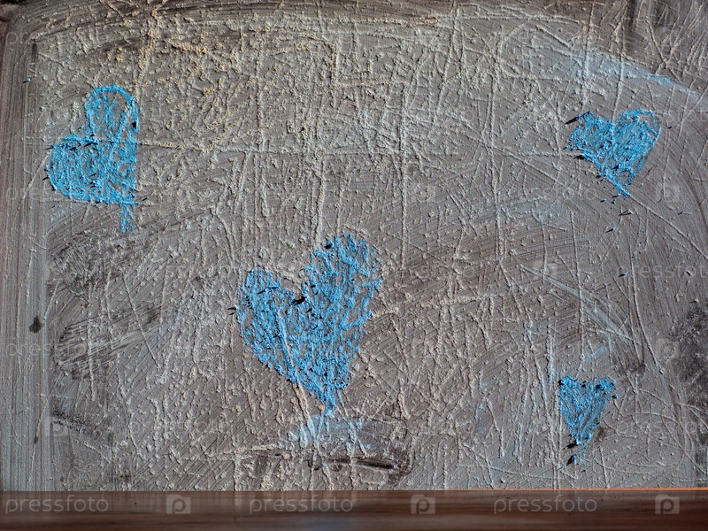 Сердца, нарисованные синим мелом на потертой, поцарапанной старой доске. Символ любви — сердце, нарисованное синим мелом на потертой фактурной серой стене