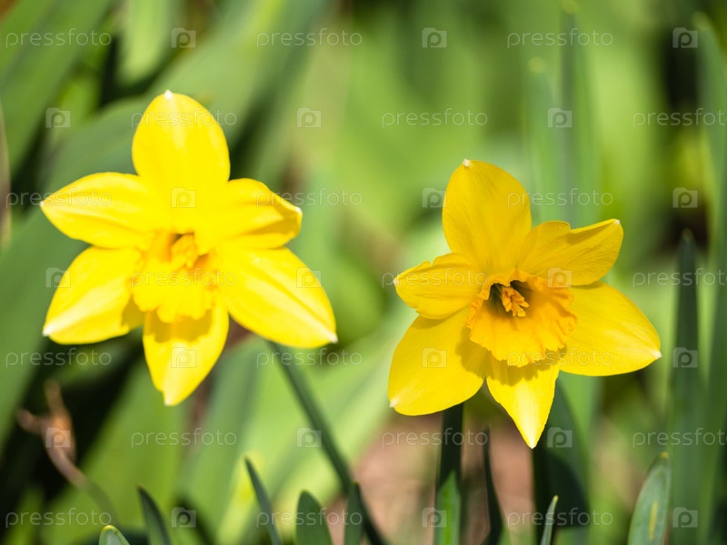 Желтые нарциссы - первые весенние цветы на открытом воздухе в парке - солнечный ярко-зеленый фон - весна нарциссов