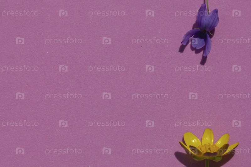 Розовый фон с текстурированными натуральными желтыми и фиолетовыми цветами, плоский вид сверху. Синие и желтые цветы на розовой поверхности