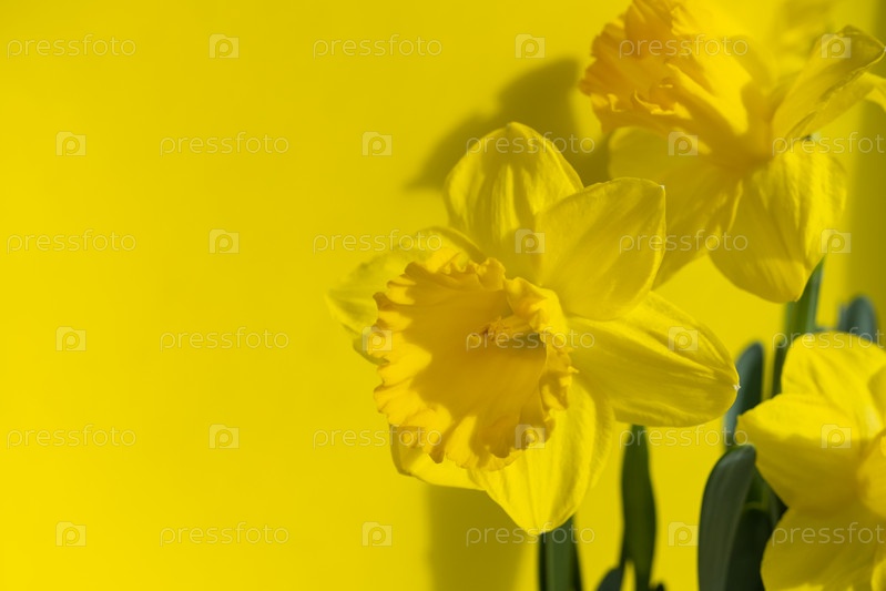 Желтые нарциссы на желтом фоне, букет цветов нарцисса