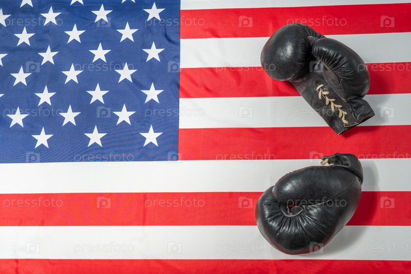 Боксерские перчатки и фон с американским флагом. Вид сверху, место для копирования