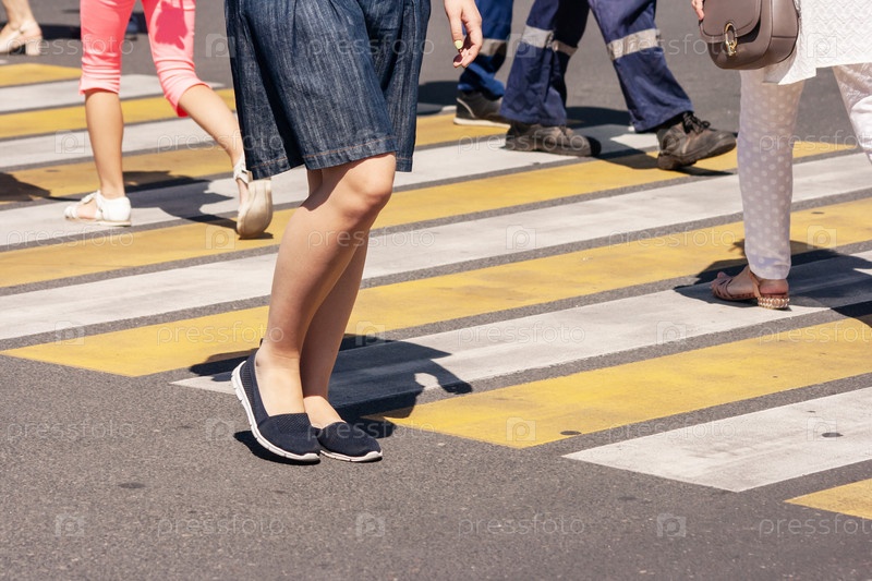 Ноги пешеходов идущих через дорогу, пешеходный переход