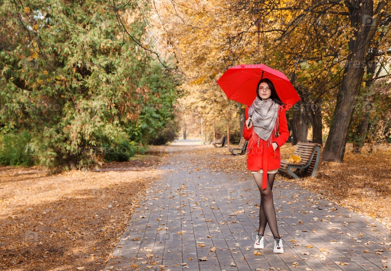 Симпатичная молодая девушка гуляет в парке осенью