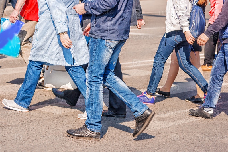 Ноги пешеходов идущих через дорогу, пешеходный переход