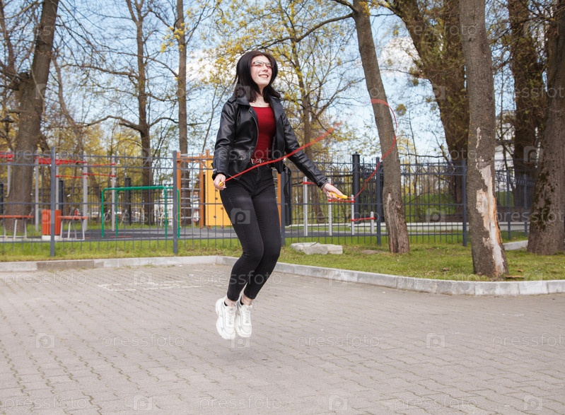 Симпатичная молодая девушка гуляет в парке осенью, прыгает на скакалке
